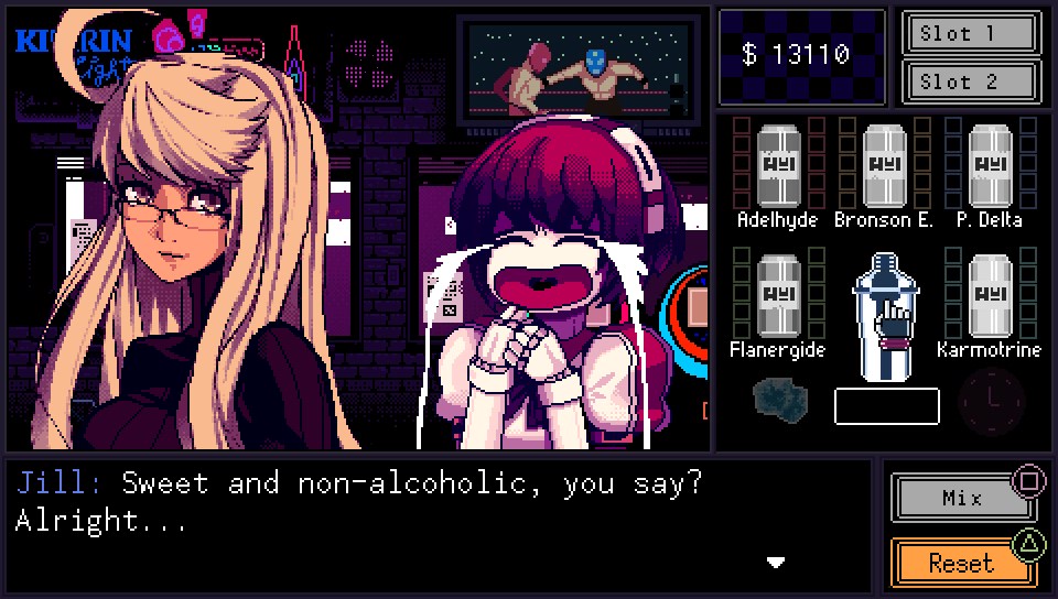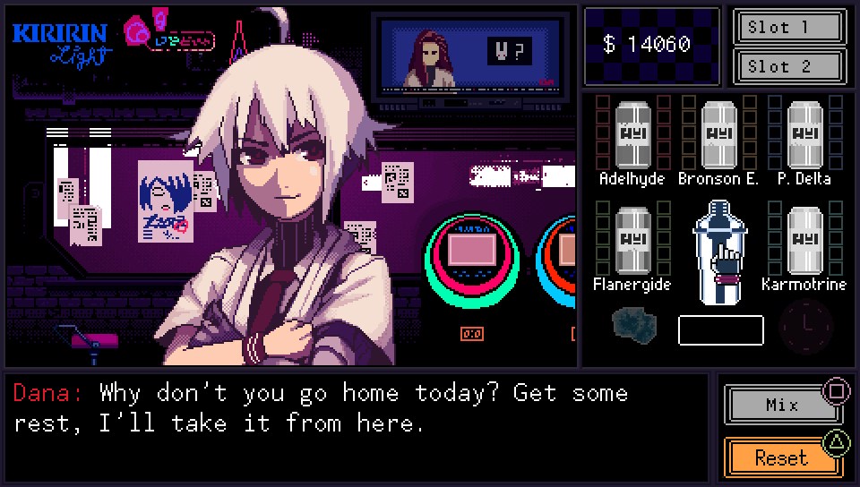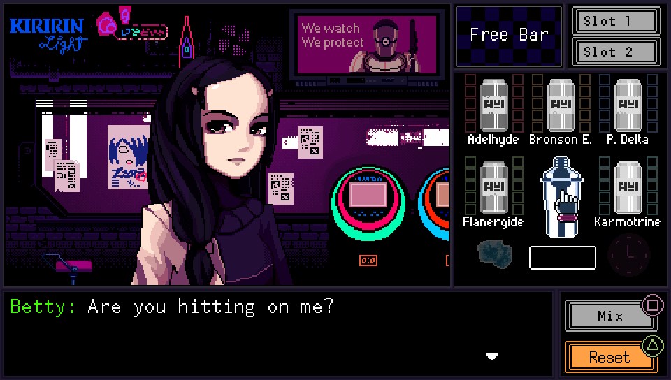 You are a bartender at VA-11 HALL-A, affectionately nicknamed "Valhalla." Although it is just a small bar downtown, it attracts the most fascinating people this side of dystopia. Keep your clients lubricated and you will be made privy to the most interesting stories.